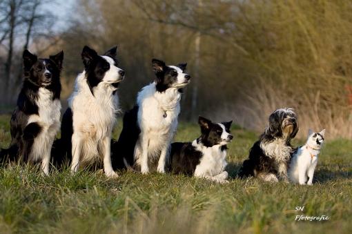 Von links nach rechts: Nox (Onyx), Justin (Job Done), Tilly (Jewel), Ria (Never Ending Dream) , Tibet Terrier Kerry und Claudias Katze Pünktchen.