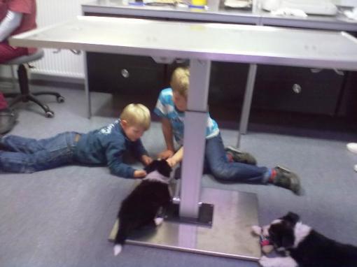 Heute morgen ging es mit den Zwillingen und Mama Orla zu unserer Tierärztin, chippen und impfen stand auf dem Programm. Die Zwerge haben die Praxis genau inspiziert und mit den Söhnen unserer Tierärztin gespielt.