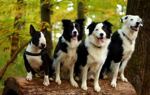 Auf dem Foto ist Phoebe mit dem Rest des Rudels zu sehen, wobei besonders Action-Man der Miniaturbullterrier der Familie heraussticht, es geht doch nichts über Schwarz-Weiß